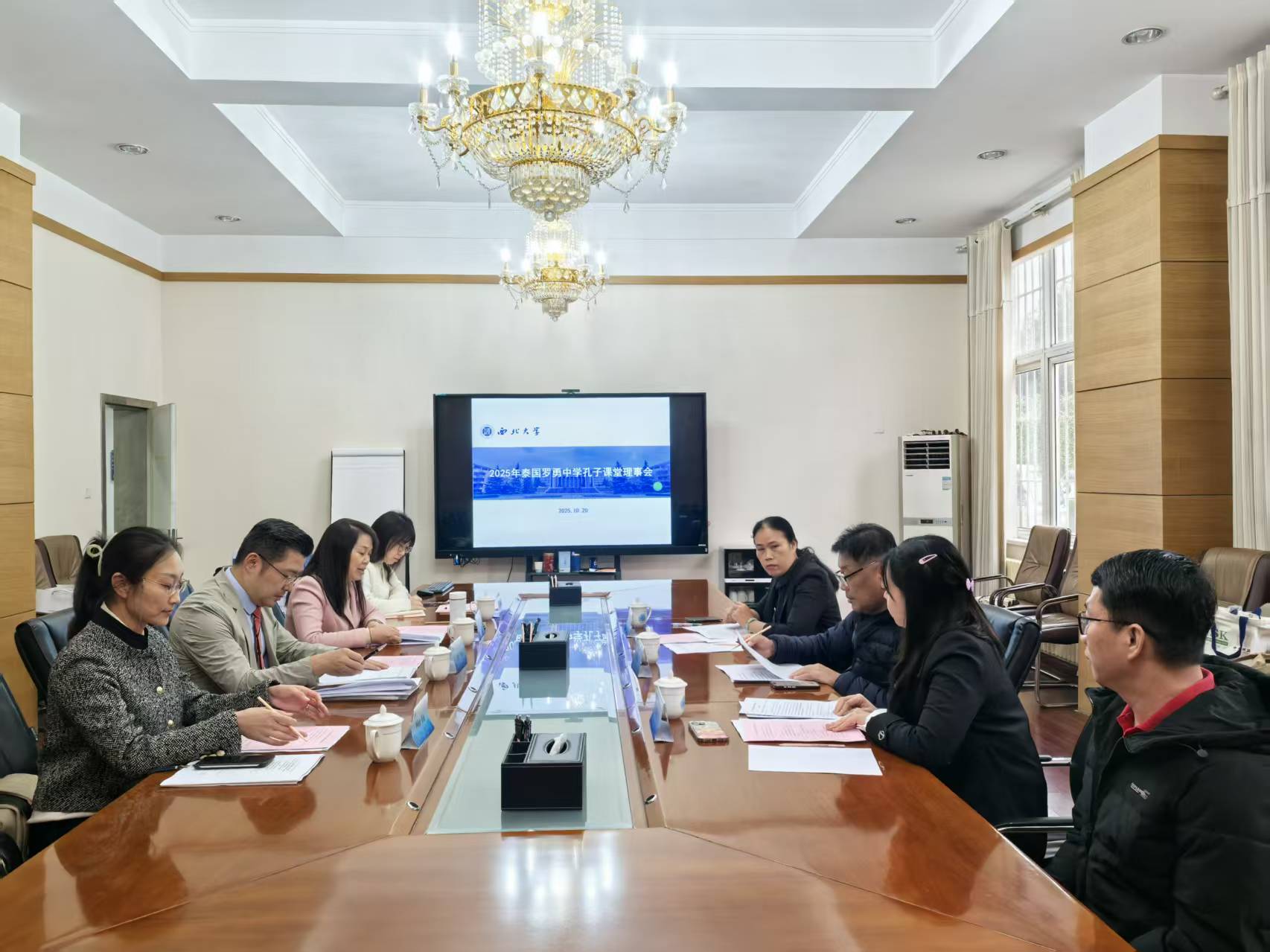 10月20日下午,我校在太白校区召开2025年泰国罗勇中学孔子课堂理事会。校党委常委、副校长范代娣,泰国罗勇中学校长陶志威(Pornsak Thipwongthong),孔子课堂中外方主任以及我校国际合作部(国际教育学院)、财务处负责人参会。会议由国际合作部(国际教育学院)负责人主持。
