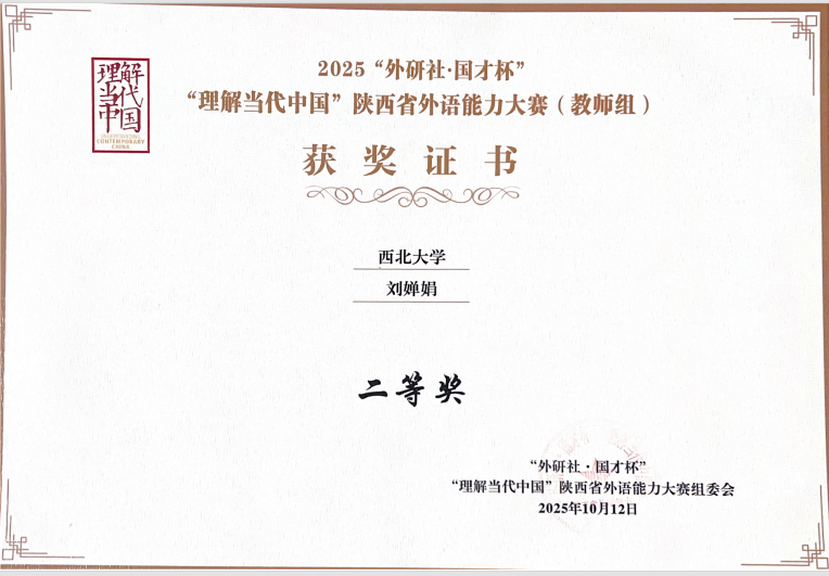 近日,2025“外研社•国才杯”“理解当代中国”陕西省外语能力大赛(教师组)在西安交通大学外国语学院落下帷幕,来自全省的36支教师团队参与本次大赛。我校外国语学院外籍教师Cynthia Liu (婵娟)及教学团队凭借创新课程设计以及对数智化教学技术的娴熟运用,荣获二等奖。