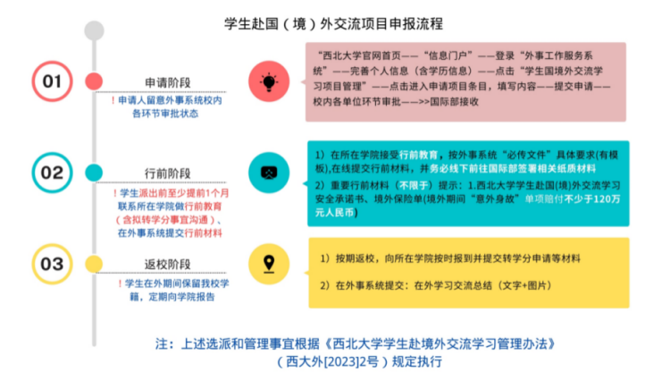 1.【校内申请】:有意向申报学生于5月1日前完成西北大学外事工作服务系统的在线申请,并跟进系统审核进度,在5月10日前获得除国际部外校内单位审批。